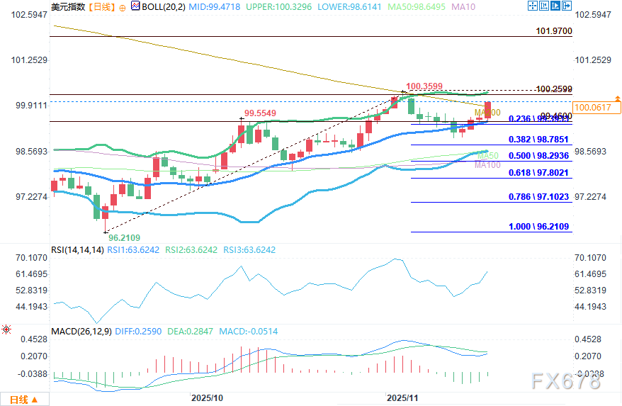 汇通财经APP讯——周三(11月19日)美盘时段,美元指数震荡上行,盘中上破200日均线和100美元重要心理关口。随