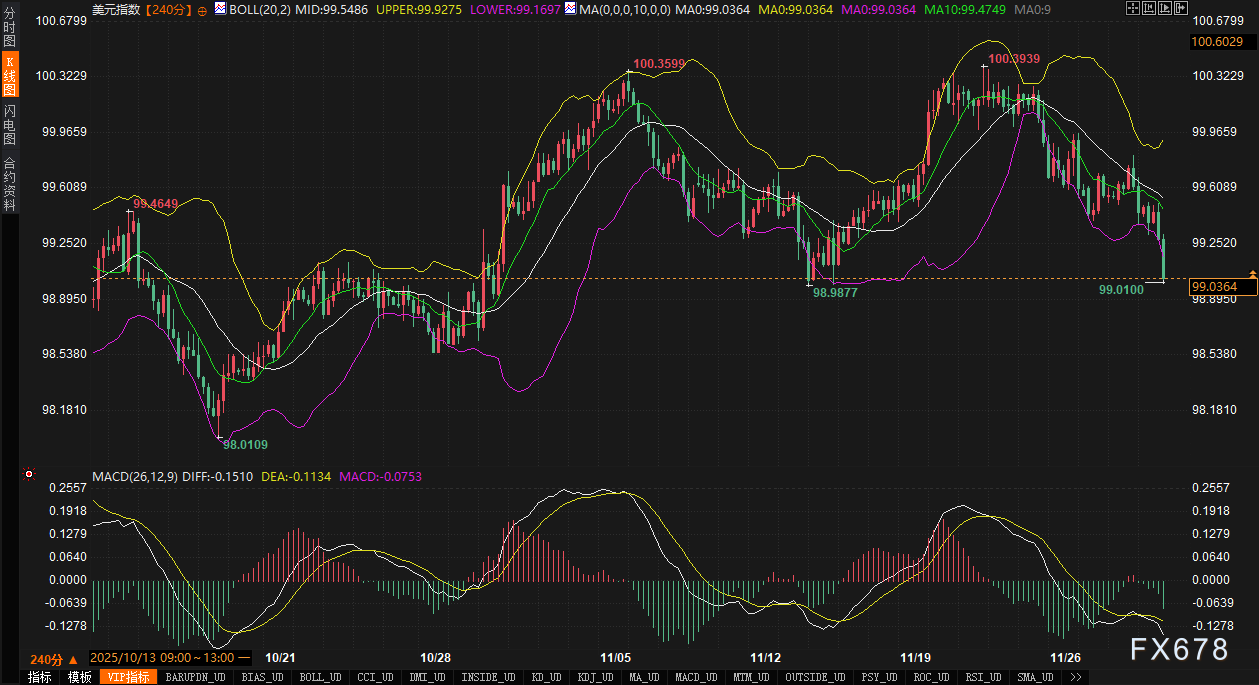 从技术面剖析,美元指数240分钟图走势偏弱。价格已跌破布林带中轨(99.5476),并向下轨(99.1651)方向运行,目前交投于99.01附近。MACD指标中DIFF与DEA线均运行于零轴下方,且DIFF(-0.1519)位于DEA(-0.1136)之下,显示短期下跌动能有所增强。指数已测试并短暂跌破11月17日低点(约99.24附近),若该位置确认失守,则可能打开进一步下行空间。