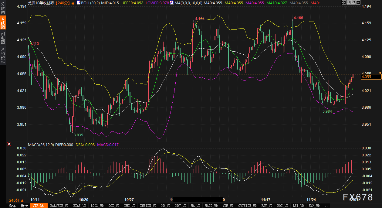 从技术面分析,10年期美债收益率在240分钟图上显示出短期反弹动能。其价格目前运行于布林带(参数20,2)中轨(4.015%)与上轨(4.049%)之间,日内一度测试上轨阻力。MACD指标(参数26,12,9)的DIFF线与DEA线虽位于零轴下方,但DIFF(-0.000)有上穿DEA(-0.008)的迹象,暗示下跌动能可能减弱,短期存在进一步技术性反弹的空间。根据知名机构分析,市场存在战术性做空10年期国债(在3.99%附近)的头寸,其目标回补区间可能在4.05%至4.09%一带。因此,未来2-3个交易日,10年期美债收益率的核心震荡区间可关注4.02%(布林带中轨与近期支撑)至4.09%(近期技术阻力及空头回补目标区)。盘中需密切关注收益率能否有效站稳4.05%上方,以及在日本央行预期持续发酵下,是否会测试更高阻力。