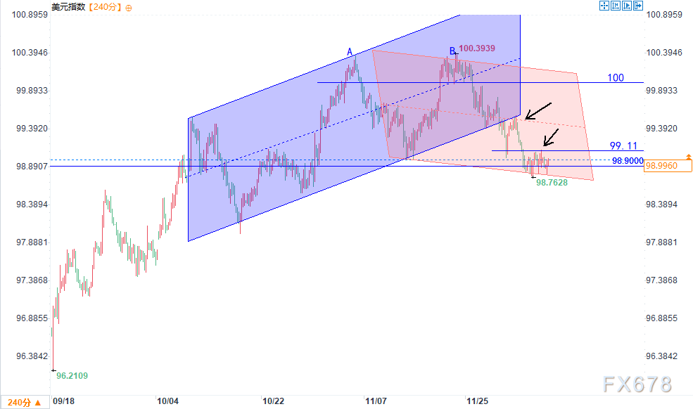 11月24日我们曾指出关键观点:→强调100.20点附近阻力位的重要性;→构建了双趋势通道分析体系。