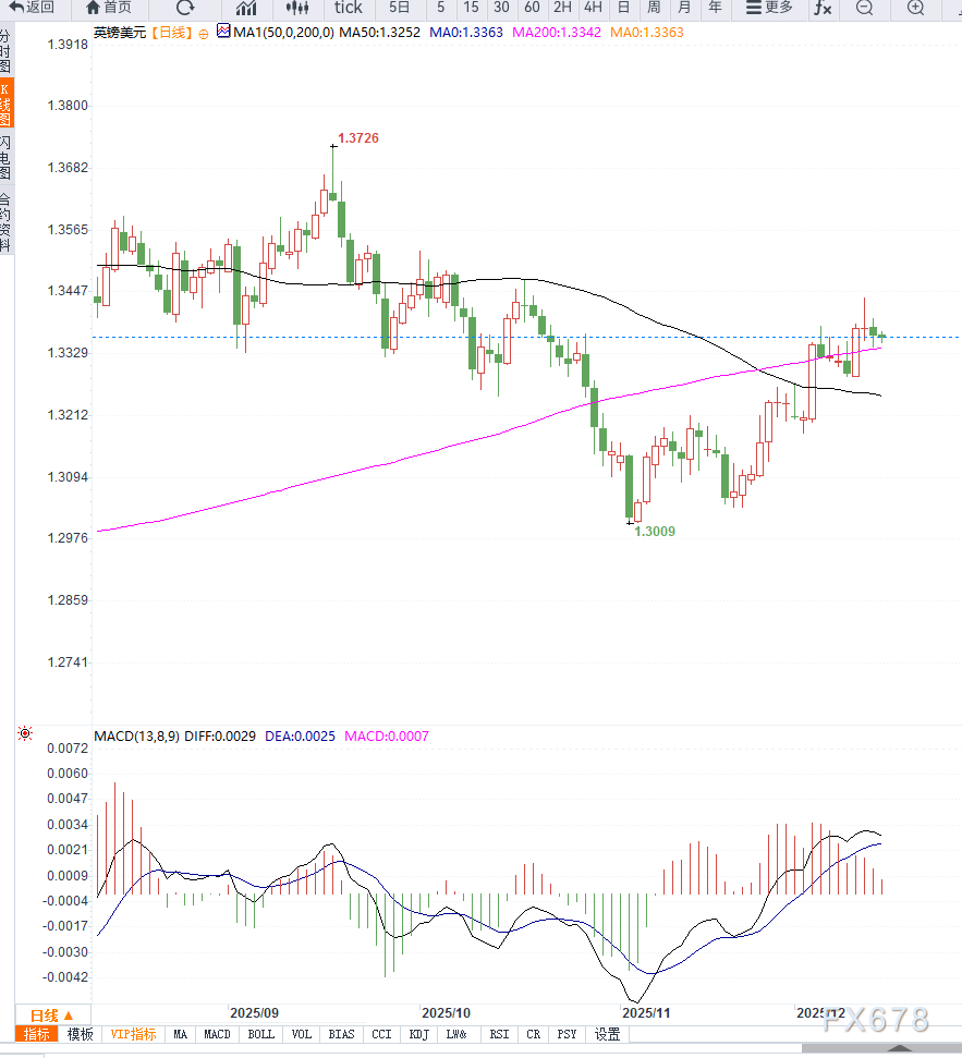 下方支撑关注200日均线及1.3325,进一步支撑在1.3300附近;上方阻力关注1.3385及1.3420区域;